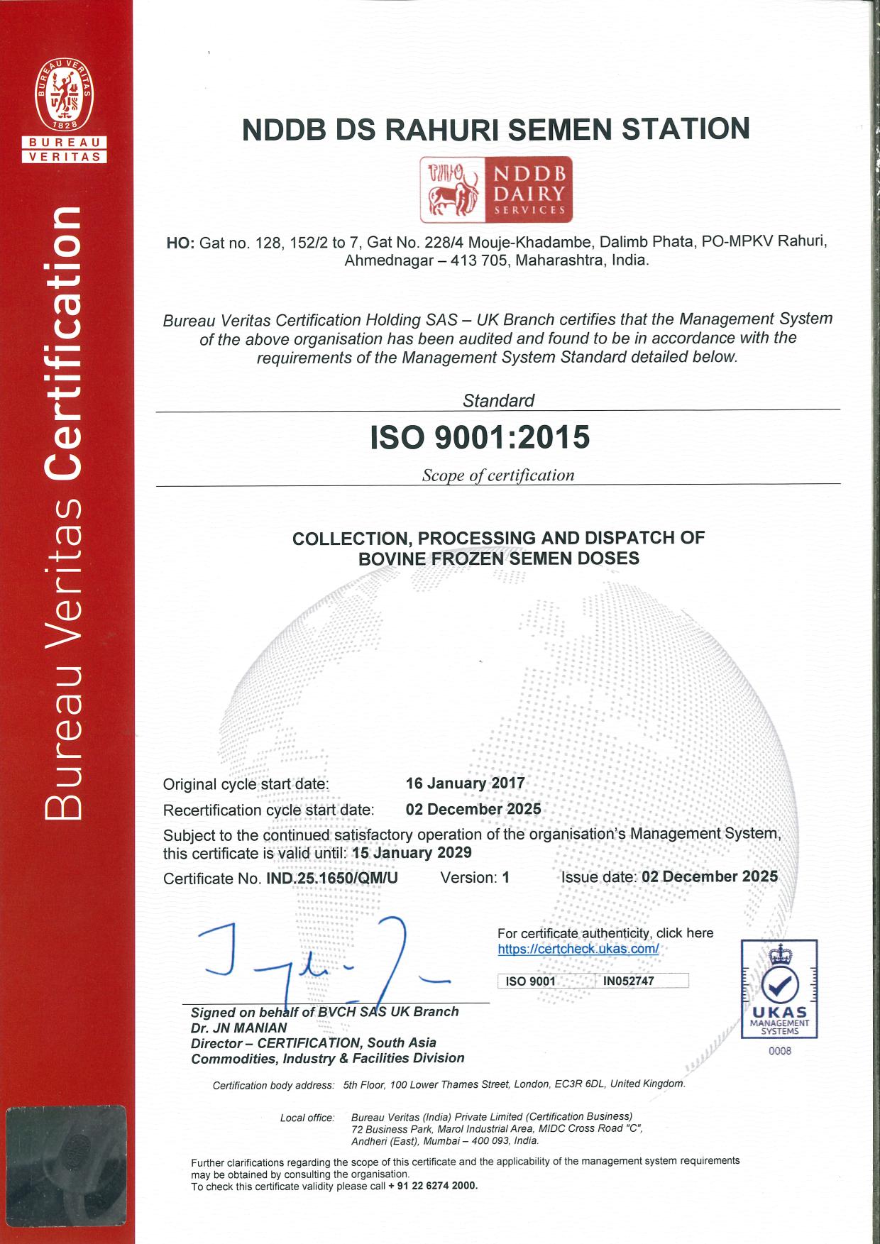 Rahuri Semen Station received ISO 9001: 2015 accreditation valid till 15 January